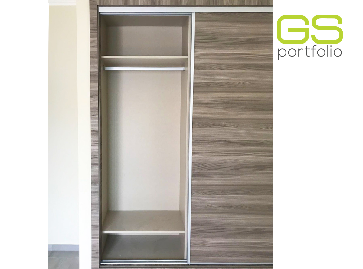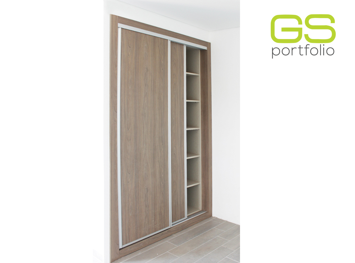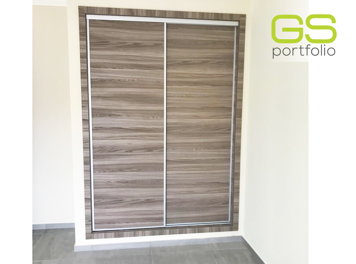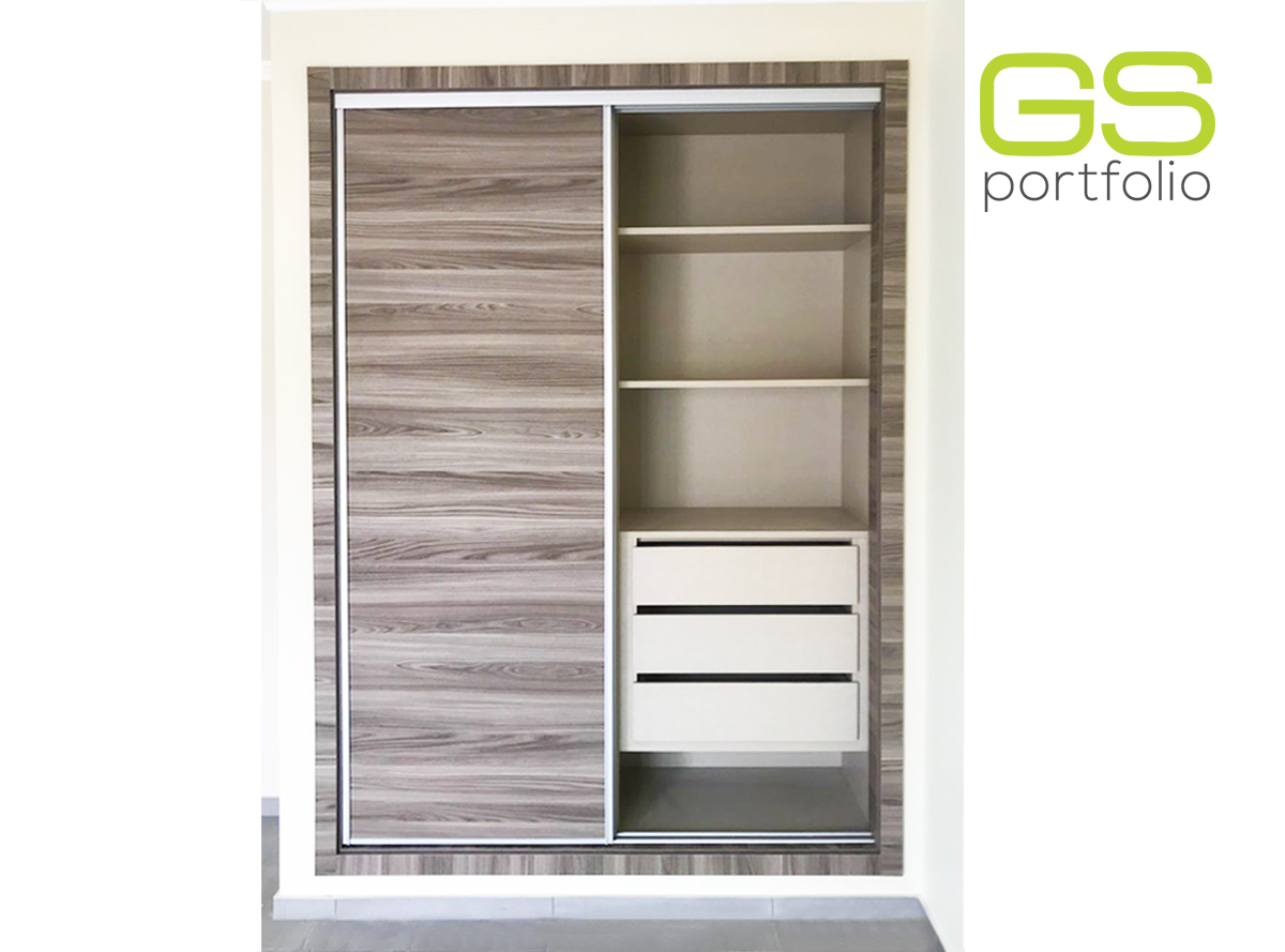 - Armario empotrado GS CONCEPT de 2 puertas correderas. Acabado en lámina vinílica: Olmo Gris y perfil lateral tirador de aluminio.