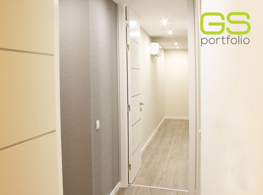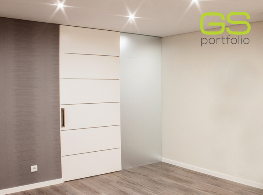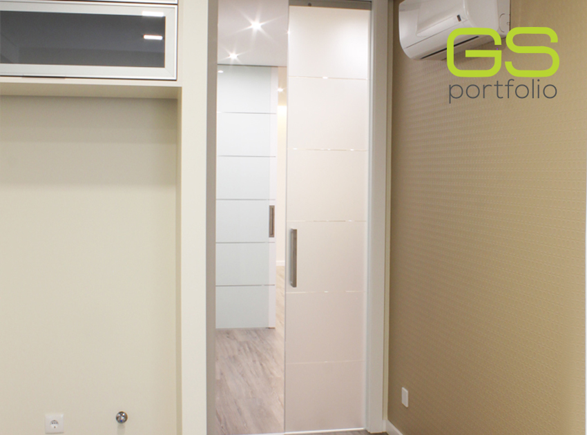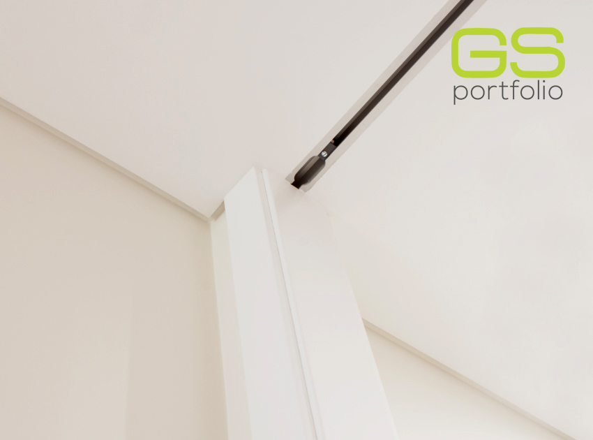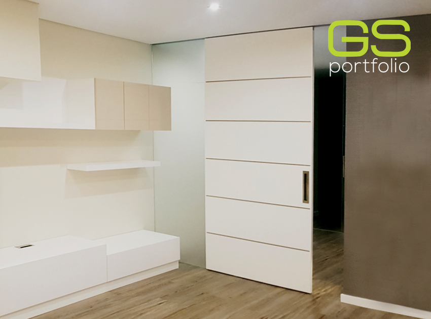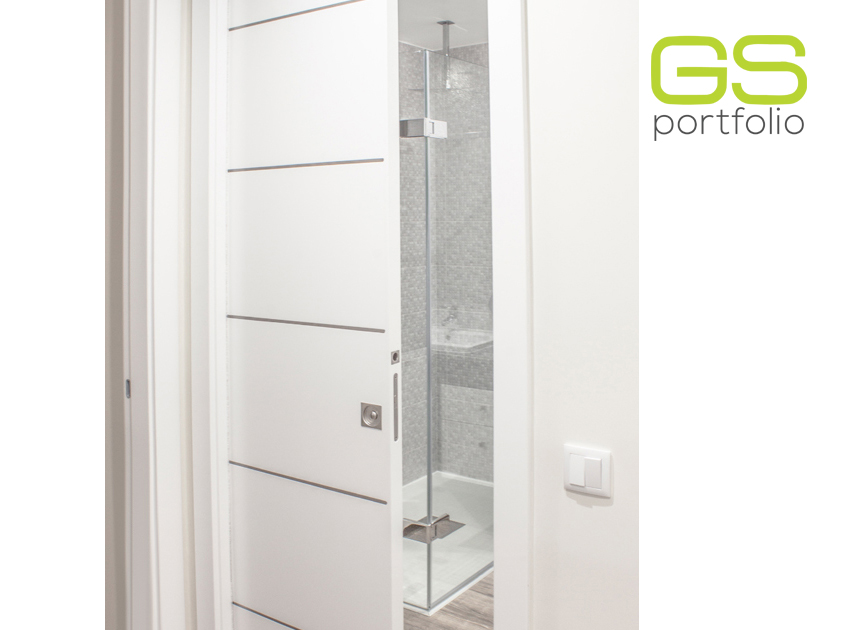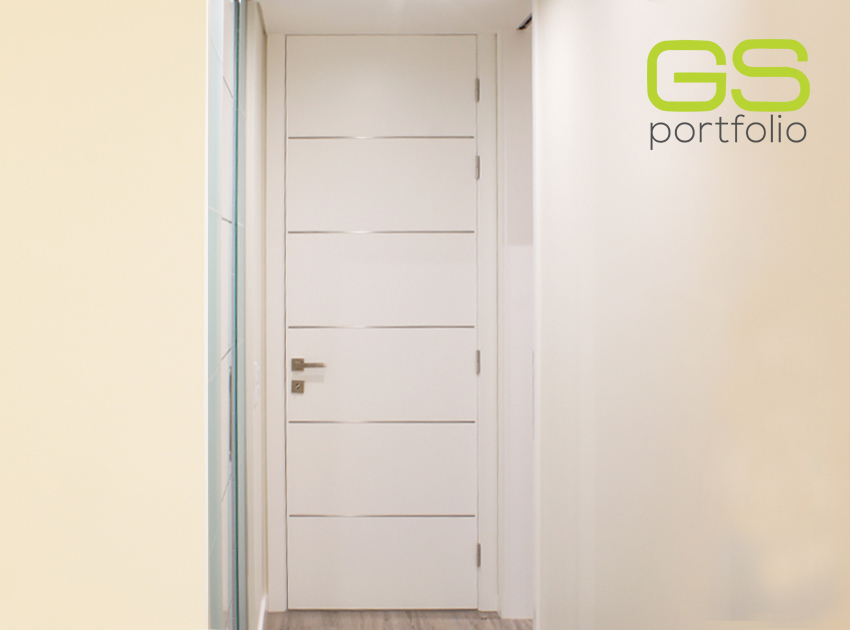 - Puerta batiente GS DOORS modelo PLUS (hasta el techo), en lacado blanco mate con rincones. Cerradura magnética.