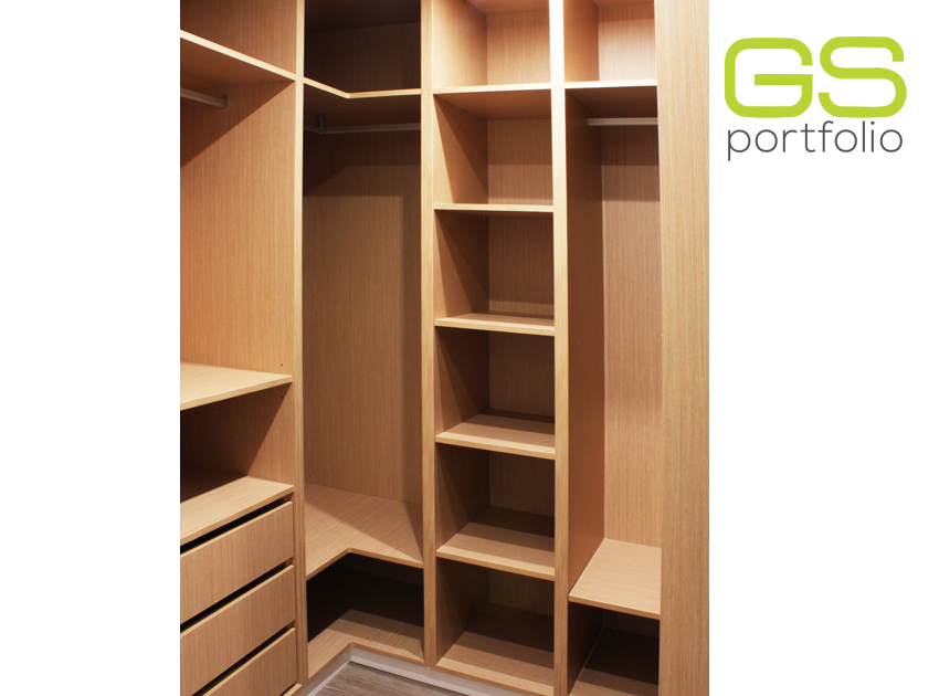 - Closet GS CONCEPT con separadores, zapatero y cajones con corredizas ocultas y sistema soft close. Compartimiento cerrado con puerta corredera en vidrio blanco mate.