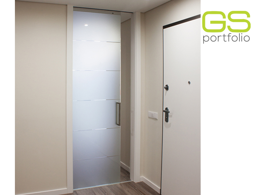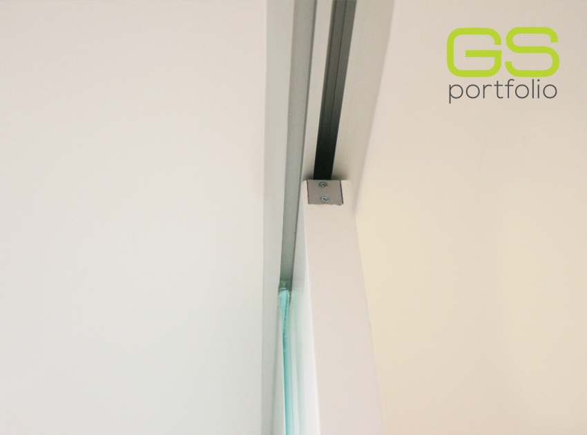 - Armazón para puerta corredera OPENSPACE – modelo UNICO PLUS. Puerta de vidrio blanco mate con rincones.