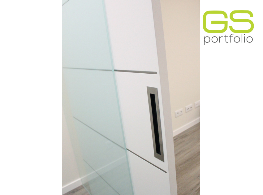 - Sistema para puerta corredera INSIDE de OPENSPACE con puerta lacada en blanco mate con rincones. Conjugado con panel fijo en vidrio blanco mate con rincones.
